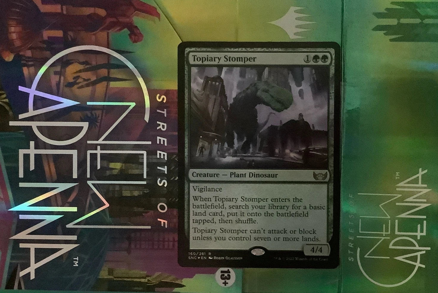 The MTG SNC Topiary Stomper is a rare foil creature card from the Streets of New Capenna set in the game Magic: The Gathering. With a green color attribute, it features a plant and dinosaur theme, making it a unique addition to any player's deck. This 2022 release by Wizards of the Coast boasts a high defense and attack power of 4, while also being a valuable collectible for fans and collectors alike. Illustrated by Robin Olausson, this English language card named Topiary Stomper is a must-have for players aged 13 and above.